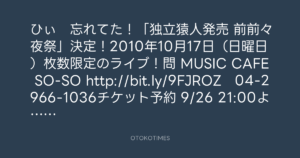 ひぃ 忘れてた!「独立猿人発売 前前々夜祭」決定!2010年10月17日(日曜日)枚数限定のライブ!問 MUSIC CAFE SO-SO http://bit.ly/9FJROZ 04-2966-1036チケット予約 9/26 21:00より メール予約のみの受付!