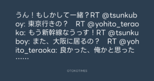 うん!もしかして一緒?RT @tsunkuboy: 東京行きの? RT @yohito_teraoka: もう新幹線なうっす!RT @tsunkuboy: また、大阪に居るの? RT @yohito_teraoka: 良かった、俺かと思った〜
