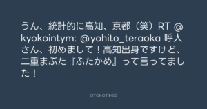 うん、統計的に高知、京都(笑)RT @kyokointym: @yohito_teraoka 呼人さん、初めまして!高知出身ですけど、二重まぶた『ふたかめ』って言ってました!