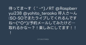 待ってま〜す(^ー^)ノRT @Raspberryui238 @yohito_teraoka 呼人さ〜ん♪SO-SOでまたライブしてくれるんですね〜(^O^)/予約メールしてみたけど…取れるかな〜?!楽しみにしてます!!!
