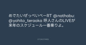 寺岡呼人 @yohito_teraoka – 23:48・2010年9月28日 2010 9/28 寺岡呼人 2010-09-28 めでたいぜっべいべーRT @nathabu: @yohito_teraoka 呼人さんのLIVEが来年のスケジュール一番乗りよ。 Source:https://x.com/yohito_teraoka/status/25791156810 text X Post 寺岡呼人 寺岡呼人 この記事が気に入ったら フォローしてね! Follow @OtokoTimes1988 よかったらシェアしてね! URLをコピーしました! 寺岡呼人 @yohito_teraoka - 23:47・2010年9月28日 寺岡呼人 @yohito_teraoka - 23:53・2010年9月28日 関連記事 Artist 寺岡呼人 1968.02.07