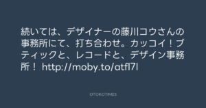 続いては、デザイナーの藤川コウさんの事務所にて、打ち合わせ。カッコイ!ブティックと、レコードと、デザイン事務所! http://moby.to/atfl7l