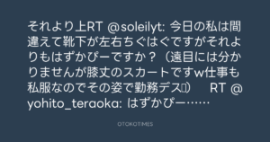 それより上RT @soleilyt: 今日の私は間違えて靴下が左右ちぐはぐですがそれよりもはずかぴーですか?(遠目には分かりませんが膝丈のスカートですw仕事も私服なのでその姿で勤務デス☆) RT @yohito_teraoka: はずかぴーことしてもうた!