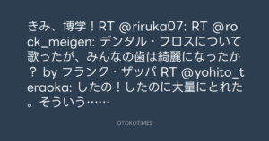 きみ、博学!RT @riruka07: RT @rock_meigen: デンタル・フロスについて歌ったが、みんなの歯は綺麗になったか? by フランク・ザッパ RT @yohito_teraoka: したの!したのに大量にとれた。そういう歯のカタチみたい。