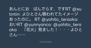 あんとにお ばんでらす、ですRT @sutintin: よひとさん顎われてたイメージあったのに。 RT @yohito_teraoka: おいRT @yunnyanco: @yohito_teraoka 「花火」見ました!・・・よひとさんってこんな顔でしたっけ?