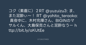 寺岡呼人 @yohito_teraoka – 2:20・2010年10月6日 2010 10/06 寺岡呼人 2010-10-06 コク(素直に)2RT @yuzuizu3: ま、また泥酔ぃ〜! RT @yohito_teraoka: 真夜中に、木村充揮さん、BIGINのマサルくん、大島保克さんと泥酔なうー http://bit.ly/aKUtEe Source:https://x.com/yohito_teraoka/status/26475404233 text X Post 寺岡呼人 寺岡呼人 この記事が気に入ったら フォローしてね! Follow @OtokoTimes1988 よかったらシェアしてね! URLをコピーしました! 寺岡呼人 @yohito_teraoka - 2:20・2010年10月6日 寺岡呼人 @yohito_teraoka - 11:26・2010年10月6日 関連記事 Artist 寺岡呼人 1968.02.07