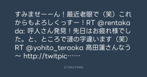 すみませーーん!最近老眼で(笑)これからもよろしくっすー!RT @rentakada: 呼人さん発見!先日はお疲れ様でした。と、ところで漣の字違います(笑)RT @yohito_teraoka 高田蓮さんなう〜 http://twitpic.com/2v1aah