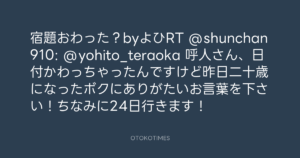 宿題おわった?byよひRT @shunchan910: @yohito_teraoka 呼人さん、日付かわっちゃったんですけど昨日二十歳になったボクにありがたいお言葉を下さい!ちなみに24日行きます!