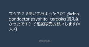 寺岡呼人 @yohito_teraoka – 16:15・2010年10月9日 2010 10/09 寺岡呼人 2010-10-09 マジで??聞いてみようか?RT @dondondoctor @yohito_teraoka 買えなかったです(;_;)追加販売お願いします(>人<) Source:https://x.com/yohito_teraoka/status/26823492626 text X Post 寺岡呼人 寺岡呼人 この記事が気に入ったら フォローしてね! Follow @OtokoTimes1988 よかったらシェアしてね! URLをコピーしました! 寺岡呼人 @yohito_teraoka - 13:24・2010年10月9日 寺岡呼人 @yohito_teraoka - 23:16・2010年10月9日 関連記事 Artist 寺岡呼人 1968.02.07