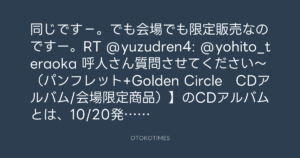 同じです−。でも会場でも限定販売なのですー。RT @yuzudren4: @yohito_teraoka 呼人さん質問させてください~(パンフレット+Golden Circle CDアルバム/会場限定商品)】のCDアルバムとは、10/20発売のものとは違うものですか?(?_?)