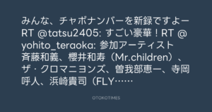 みんな、チャボナンバーを新録ですよーRT @tatsu2405: すごい豪華!RT @yohito_teraoka: 参加アーティスト 斉藤和義、櫻井和寿(Mr.children)、ザ・クロマニヨンズ、曽我部恵一、寺岡呼人、浜崎貴司(FLYING KIDS)、宮沢和史、吉井和哉