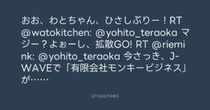 おお、わとちゃん、ひさしぶりー!RT @watokitchen: @yohito_teraoka マジー?よぉーし、拡散GO! RT @riemink: @yohito_teraoka 今さっき、J-WAVEで「有限会社モンキービジネス」がかかっていました!!