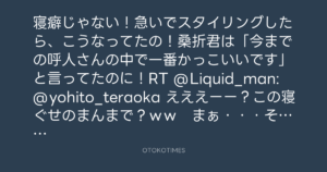 寝癖じゃない!急いでスタイリングしたら、こうなってたの!桑折君は「今までの呼人さんの中で一番かっこいいです」と言ってたのに!RT @Liquid_man: @yohito_teraoka えええーー?この寝ぐせのまんまで?ww まぁ・・・そこは42歳のオトコの溢れる魅力でww