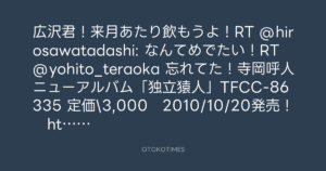 広沢君!来月あたり飲もうよ!RT @hirosawatadashi: なんてめでたい!RT @yohito_teraoka 忘れてた!寺岡呼人ニューアルバム「独立猿人」TFCC-86335 定価\3,000 2010/10/20発売! http://bit.ly/a98yK2