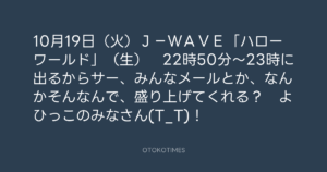 寺岡呼人 @yohito_teraoka – 0:13・2010年10月18日 2010 10/18 寺岡呼人 2010-10-18 10月19日(火)J-WAVE「ハローワールド」(生) 22時50分~23時に出るからサー、みんなメールとか、なんかそんなんで、盛り上げてくれる? よひっこのみなさん(T_T)! Source:https://x.com/yohito_teraoka/status/27645683274 text X Post 寺岡呼人 寺岡呼人 この記事が気に入ったら フォローしてね! Follow @OtokoTimes1988 よかったらシェアしてね! URLをコピーしました! 寺岡呼人 @yohito_teraoka - 23:42・2010年10月16日 寺岡呼人 @yohito_teraoka - 0:18・2010年10月18日 関連記事 Artist 寺岡呼人 1968.02.07