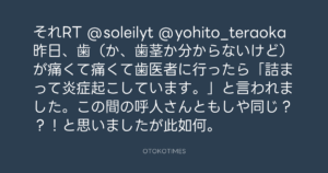 それRT @soleilyt @yohito_teraoka 昨日、歯(か、歯茎か分からないけど)が痛くて痛くて歯医者に行ったら「詰まって炎症起こしています。」と言われました。この間の呼人さんともしや同じ??!と思いましたが此如何。