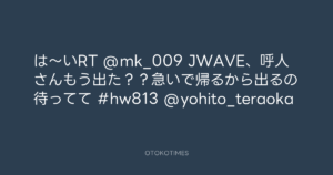 寺岡呼人 @yohito_teraoka – 22:48・2010年10月19日 2010 10/19 寺岡呼人 2010-10-19 は〜いRT @mk_009 JWAVE、呼人さんもう出た??急いで帰るから出るの待ってて #hw813 @yohito_teraoka Source:https://x.com/yohito_teraoka/status/27834502638 text X Post 寺岡呼人 寺岡呼人 この記事が気に入ったら フォローしてね! Follow @OtokoTimes1988 よかったらシェアしてね! URLをコピーしました! 寺岡呼人 @yohito_teraoka - 22:46・2010年10月19日 寺岡呼人 @yohito_teraoka - 22:50・2010年10月19日 関連記事 Artist 寺岡呼人 1968.02.07