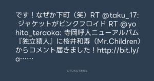 です!なぜか下町(笑)RT @taku_17: ジャケットがピンクフロイド RT @yohito_teraoka: 寺岡呼人ニューアルバム『独立猿人』に桜井和寿(Mr.Children)からコメント届きました!http://bit.ly/a98yK2 #dokuritsu