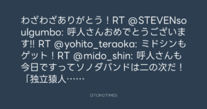 わざわざありがとう!RT @STEVENsoulgumbo: 呼人さんおめでとうございます!! RT @yohito_teraoka: ミドシンもゲット!RT @mido_shin: 呼人さんも今日ですってソノダバンドは二の次だ!「独立猿人」&「Golden Circle」