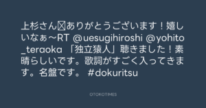 寺岡呼人 @yohito_teraoka – 9:33・2010年10月22日 2010 10/22 寺岡呼人 2010-10-22 上杉さん‼ありがとうございます!嬉しいなぁ〜RT @uesugihiroshi @yohito_teraoka 「独立猿人」聴きました!素晴らしいです。歌詞がすごく入ってきます。名盤です。 #dokuritsu Source:https://x.com/yohito_teraoka/status/28356443368 text X Post 寺岡呼人 寺岡呼人 この記事が気に入ったら フォローしてね! Follow @OtokoTimes1988 よかったらシェアしてね! URLをコピーしました! 寺岡呼人 @yohito_teraoka - 9:32・2010年10月22日 寺岡呼人 @yohito_teraoka - 9:48・2010年10月22日 関連記事 Artist 寺岡呼人 1968.02.07