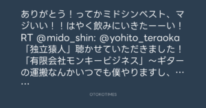ありがとう!ってかミドシンベスト、マジいい!!はやく飲みにいきたーーい!RT @mido_shin: @yohito_teraoka 「独立猿人」聴かせていただきました!「有限会社モンキービジネス」~ギターの運搬なんかいつでも僕やりますし、「パーフェクトゲーム」から「眼」への流れ