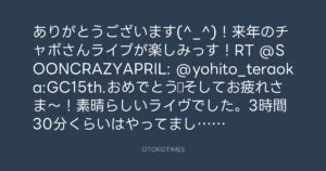 ありがとうございます(^_^)!来年のチャボさんライブが楽しみっす!RT @SOONCRAZYAPRIL: @yohito_teraoka:GC15th.おめでとう♪そしてお疲れさま〜!素晴らしいライヴでした。3時間30分くらいはやってましたね〜〜段々ヒトのライヴが長いッ!