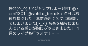 是非(^_^)!YジャンプしよーぜRT @kami1201: @yohito_teraoka 昨日はお疲れ様でした!素敵過ぎて久々に感動してしまいました(>_<) 音楽を純粋に楽しんでいる感じが胸にグッときました! 1月のライブも行きます!楽しみにしてます!!