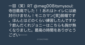 一回(笑)RT @meg008itsmysoul: 寺田最高でした!!あれはトイレには絶対行けません!モニカマン(笑)脱帽です。ほんとはどのくらい練習したんですか?飲んだくれジョニーはこちらも胸が熱くなりました。最高の時間をありがとうございました!@yohito_teraoka