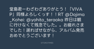 堂島君ーわざわざありがとう!「VIVAP」同様よろしくっす!!RT @Dojima_Kohei: @yohito_teraoka 昨日は観に行けなくて残念でした。。お疲れさまでした!遅ればせながら、アルバム発売おめでとうございます!