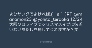 寺岡呼人 @yohito_teraoka – 17:27・2010年10月25日 2010 10/25 寺岡呼人 2010-10-25 よひサンタでよければ♪(´ε` )RT @manamon23 @yohito_teraoka 12/24大阪ソロライブでクリスマスイブに彼氏いないあたしを癒してくれますか?笑 Source:https://x.com/yohito_teraoka/status/28671702317 text X Post 寺岡呼人 寺岡呼人 この記事が気に入ったら フォローしてね! Follow @OtokoTimes1988 よかったらシェアしてね! URLをコピーしました! 寺岡呼人 @yohito_teraoka - 15:29・2010年10月25日 寺岡呼人 @yohito_teraoka - 17:33・2010年10月25日 関連記事 Artist 寺岡呼人 1968.02.07