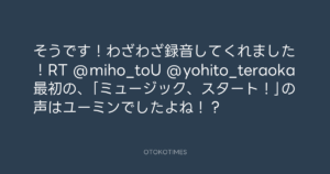 寺岡呼人 @yohito_teraoka – 17:46・2010年10月25日 2010 10/25 寺岡呼人 2010-10-25 そうです!わざわざ録音してくれました!RT @miho_toU @yohito_teraoka 最初の、「ミュージック、スタート!」の声はユーミンでしたよね!? Source:https://x.com/yohito_teraoka/status/28672592606 text X Post 寺岡呼人 寺岡呼人 この記事が気に入ったら フォローしてね! Follow @OtokoTimes1988 よかったらシェアしてね! URLをコピーしました! 寺岡呼人 @yohito_teraoka - 17:36・2010年10月25日 寺岡呼人 @yohito_teraoka - 17:51・2010年10月25日 関連記事 Artist 寺岡呼人 1968.02.07