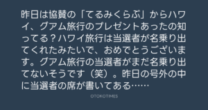 昨日は協賛の「てるみくらぶ」からハワイ、グアム旅行のプレゼントあったの知ってる?ハワイ旅行は当選者が名乗り出てくれたみたいで、おめでとうございます。グアム旅行の当選者がまだ名乗り出てないそうです(笑)。昨日の号外の中に当選者の席が書いてあるので、是非、確認しててるみくらぶへ連絡を