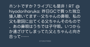 ホントですか?ライブにも是非!RT @hiyodoriharuka: 昨日GCで買った独立猿人聴いてます‥父ちゃんの鼻唄、私の父も歌詞に出てくる父ちゃんそのもので、あの鼻唄はうちでは子守唄。いつからか遠ざけてしまってた父とちゃんと向き合って話したいなぁと思いました。