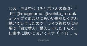 RT @mogmomo: @yohito_teraoka ライブであまりにもいい曲をたくさん聴いてしまったので、ライブ終わりに会場で「独立猿人」購入しました!んで、仕事中に聴いて泣いてます(T^T)。w