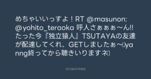 めちゃいいっすよ!RT @masunon: @yohito_teraoka 呼人さぁぁぁ〜ん!!たった今『独立猿人』TSUTAYAの友達が配達してくれ、GETしましたぁ〜☆yanng終ってから聴きいりますネ☆