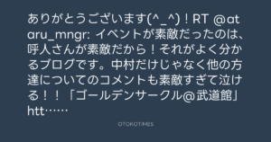 ありがとうございます(^_^)!RT @ataru_mngr: イベントが素敵だったのは、呼人さんが素敵だから!それがよく分かるブログです。中村だけじゃなく他の方達についてのコメントも素敵すぎて泣ける!!「ゴールデンサークル@武道館」http://bit.ly/aWvCKd