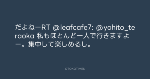 寺岡呼人 @yohito_teraoka – 16:48・2010年10月27日 2010 10/27 寺岡呼人 2010-10-27 だよねーRT @leafcafe7: @yohito_teraoka 私もほとんど一人で行きますよー。集中して楽しめるし。 Source:https://x.com/yohito_teraoka/status/28869347030 text X Post 寺岡呼人 寺岡呼人 この記事が気に入ったら フォローしてね! Follow @OtokoTimes1988 よかったらシェアしてね! URLをコピーしました! 寺岡呼人 @yohito_teraoka - 16:27・2010年10月27日 寺岡呼人 @yohito_teraoka - 17:44・2010年10月27日 関連記事 Artist 寺岡呼人 1968.02.07