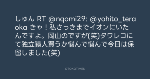 しゅん RT @nqomi29: @yohito_teraoka きゃ!私さっきまでイオンにいたんですよ。岡山のですが(笑)タワレコにて独立猿人買うか悩んで悩んで今日は保留しました(笑)
