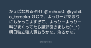 寺岡呼人 @yohito_teraoka – 22:22・2010年10月27日 2010 10/27 寺岡呼人 2010-10-27 かえばなおるぞRT @mihoo0: @yohito_teraoka GCで、よっひーがあまりにもかっこよすぎて、よっひーよっひー叫びまくってたら風邪引きました(*_*)明日独立猿人買おうかな。治るかな。 Source:https://x.com/yohito_teraoka/status/28889216028 text X Post 寺岡呼人 寺岡呼人 この記事が気に入ったら フォローしてね! Follow @OtokoTimes1988 よかったらシェアしてね! URLをコピーしました! 寺岡呼人 @yohito_teraoka - 22:18・2010年10月27日 寺岡呼人 @yohito_teraoka - 22:43・2010年10月27日 関連記事 Artist 寺岡呼人 1968.02.07