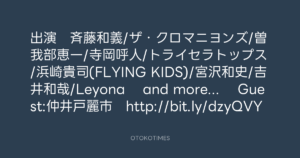 出演 斉藤和義/ザ・クロマニヨンズ/曽我部恵一/寺岡呼人/トライセラトップス/浜崎貴司(FLYING KIDS)/宮沢和史/吉井和哉/Leyona and more… Guest:仲井戸麗市 http://bit.ly/dzyQVY