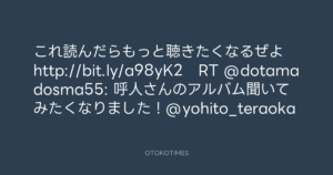 寺岡呼人 @yohito_teraoka – 0:18・2010年10月28日 2010 10/28 寺岡呼人 2010-10-28 これ読んだらもっと聴きたくなるぜよ http://bit.ly/a98yK2 RT @dotamadosma55: 呼人さんのアルバム聞いてみたくなりました!@yohito_teraoka Source:https://x.com/yohito_teraoka/status/28899287894 text X Post 寺岡呼人 寺岡呼人 この記事が気に入ったら フォローしてね! Follow @OtokoTimes1988 よかったらシェアしてね! URLをコピーしました! 寺岡呼人 @yohito_teraoka - 0:15・2010年10月28日 寺岡呼人 @yohito_teraoka - 9:41・2010年10月28日 関連記事 Artist 寺岡呼人 1968.02.07