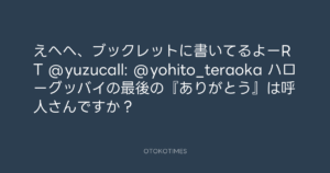 えへへ、ブックレットに書いてるよーRT @yuzucall: @yohito_teraoka ハローグッバイの最後の『ありがとう』は呼人さんですか?