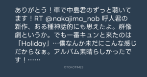 ありがとう!車で中島君のずっと聴いてます!RT @nakajima_nob 呼人君の新作、ある種神話的にも思えたよ。群像劇というか。でも一番キュンと来たのは「Holiday」…僕なんか未だにこんな感じだからなぁ。アルバム素晴らしかったです! RT @yohito_teraoka