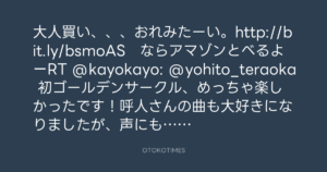大人買い、、、おれみたーい。http://bit.ly/bsmoAS ならアマゾンとべるよーRT @kayokayo: @yohito_teraoka 初ゴールデンサークル、めっちゃ楽しかったです!呼人さんの曲も大好きになりましたが、声にも惚れました♪今までのCD大人買いします!