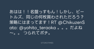 寺岡呼人 @yohito_teraoka – 2:19・2010年11月1日 2010 11/01 寺岡呼人 2010-11-01 あはは!!名盤っすもん!しかし、ビートルズ、同じの何枚買わされただろう?策略にはまってます!RT @ChikuzenSato: @yohito_teraoka 。。。だよね〜。。 つられてポチ。 Source:https://x.com/yohito_teraoka/status/29295248970 text X Post 寺岡呼人 寺岡呼人 この記事が気に入ったら フォローしてね! Follow @OtokoTimes1988 よかったらシェアしてね! URLをコピーしました! 寺岡呼人 @yohito_teraoka - 2:08・2010年11月1日 寺岡呼人 @yohito_teraoka - 2:20・2010年11月1日 関連記事 Artist 寺岡呼人 1968.02.07