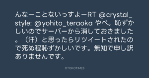 んなーことないっすよーRT @crystal_style: @yohito_teraoka やべ。恥ずかしいのでサーバーから消しておきました。(汗)と思ったらリツイートされたので死ぬ程恥ずかしいです。無知で申し訳ありませんです。