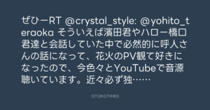 ぜひーRT @crystal_style: @yohito_teraoka そういえば濱田君やハロー橋口君達と会話していた中で必然的に呼人さんの話になって、花火のPV観て好きになったので、今色々とYouTubeで音源聴いています。近々必ず独立猿人入手させて頂きます。