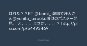 寺岡呼人 @yohito_teraoka – 17:27・2010年11月2日 2010 11/02 寺岡呼人 2010-11-02 ばれた??RT @bomi_ 韓国で呼人さん@yohito_teraoka激似のポスター発見。 え、、、まさか、、、? http://plixi.com/p/54493469 Source:https://x.com/yohito_teraoka/status/29451574705 text X Post 寺岡呼人 寺岡呼人 この記事が気に入ったら フォローしてね! Follow @OtokoTimes1988 よかったらシェアしてね! URLをコピーしました! 寺岡呼人 @yohito_teraoka - 14:34・2010年11月2日 寺岡呼人 @yohito_teraoka - 17:44・2010年11月2日 関連記事 Artist 寺岡呼人 1968.02.07