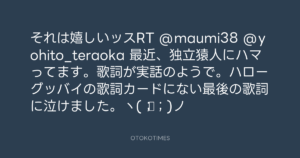 寺岡呼人 @yohito_teraoka – 17:45・2010年11月2日 2010 11/02 寺岡呼人 2010-11-02 それは嬉しいッスRT @maumi38 @yohito_teraoka 最近、独立猿人にハマってます。歌詞が実話のようで。ハローグッバイの歌詞カードにない最後の歌詞に泣けました。ヽ(;▽;)ノ Source:https://x.com/yohito_teraoka/status/29452386323 text X Post 寺岡呼人 寺岡呼人 この記事が気に入ったら フォローしてね! Follow @OtokoTimes1988 よかったらシェアしてね! URLをコピーしました! 寺岡呼人 @yohito_teraoka - 17:44・2010年11月2日 寺岡呼人 @yohito_teraoka - 17:48・2010年11月2日 関連記事 Artist 寺岡呼人 1968.02.07