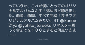 っていうか、これが僕にとってのオリジナルアルバムなんす!死ぬほど聴きました。曲順、曲間、すべて完璧!まるでオリジナルアルバムみたい。RT @kanae21yz @yohito_teraoka リマスター版って今までを100とすると何点つきます?赤青買うか迷う〜!